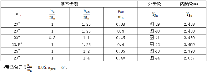 與圖39至44各齒形參數(shù)相應的內(nèi)齒輪應力修正系YSa也可由表20查取。