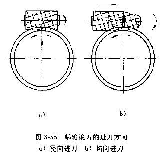 蝸輪滾刀切制蝸輪時(shí),有兩種進(jìn)刀方法,徑向進(jìn)刀法和切向進(jìn)刀法,見(jiàn)圖3-55。