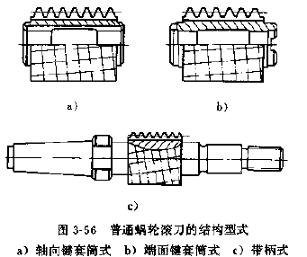 1.結(jié)構(gòu)型式,蝸輪滾刀的結(jié)構(gòu)型式分為套筒式和帶柄式兩種,見(jiàn)圖3-56,m7普通蝸輪滾刀。
