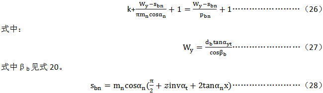 度量表面間所跨的齒數(shù)k應(yīng)這樣來選擇,即其接觸線大體上位于齒高的中間,可按下面方法來計(jì)算(圓整到最近的整數(shù)):