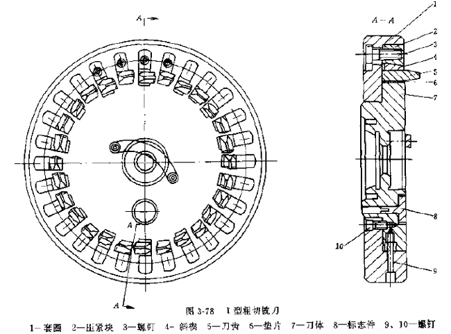 Ⅱ型雙面及三面粗切銑刀也是用于粗加工弧齒錐齒輪和準(zhǔn)雙面齒輪副中的大、小齒輪。該銑刀結(jié)構(gòu)先進(jìn),刀體強(qiáng)度高,剛性好,刀齒采用斜楔夾緊,刀齒分布緊湊,刀齒數(shù)量多,而且刀齒安裝靈活方便,這種銑刀只能用于進(jìn)口的格里森機(jī)床或新型仿制機(jī)床上。銑刀公稱直徑有5、6、6.25、7.5、9等五種,其結(jié)構(gòu)型式和基本尺寸見圖3-78和表3-154~表3-155。