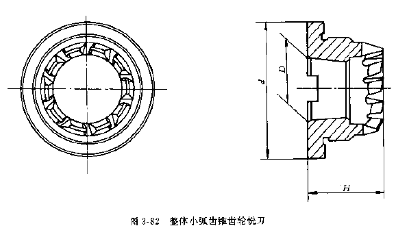 小弧齒錐齒輪銑刀用于加工小弧齒錐齒輪副中的大、小齒輪。該銑刀是雙面銑刀,外和內(nèi)刀齒各占刀齒數(shù)的一般,公稱直徑有0.5,1.1,1.3,1.5,2.0in等五種,其結(jié)構(gòu)型式和基本尺寸見(jiàn)圖3-82和表3-169~表3-170。