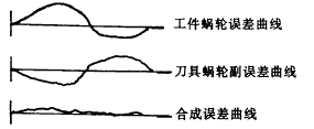 1. 累積誤差抵消。如果測(cè)出插齒機(jī)兩套蝸輪副的累積誤差是影響工件質(zhì)量的首要因素,可選用zc和z相等即z/zc=1,傳動(dòng)比等于1,使兩套蝸輪副的周期變得相同。再不斷對(duì)其中一套蝸輪進(jìn)行轉(zhuǎn)位,邊轉(zhuǎn)位邊測(cè)試曲線,直到其誤差曲線的相位變得和另一套蝸輪相反(相差180o)后固定。這樣,兩套蝸輪的累積誤差在以后的工作過(guò)程中將大部分抵消(圖3)。