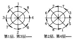 2 焊前準(zhǔn)備 (1)焊前轉(zhuǎn)軸表面應(yīng)仔細(xì)清理,嚴(yán)格清除一切會(huì)產(chǎn)生氫氣的油類等雜質(zhì)! (2)選用J857 焊條,φ3. 2mm。焊前將焊條在爐中250~300℃烘干2h,隨用隨取,消除焊條中的水分! (3)在直流電焊機(jī)上采用反接法。3 焊補(bǔ)工藝 (1)將整個(gè)轉(zhuǎn)軸放進(jìn)烘爐預(yù)熱到300℃后取出! (2)將轉(zhuǎn)軸吊到滾輪支架上,滾輪應(yīng)支承于軸上φ135及φ140兩外圓處,裝上扳轉(zhuǎn)卡箍! (3)采用對(duì)稱交錯(cuò)焊補(bǔ),每圈分8段,每層接頭收尾均應(yīng)錯(cuò)開(kāi), 填滿弧坑, 電流值取90A~100A,慢焊速,以防止轉(zhuǎn)軸過(guò)熱,減小熔深和熱影響區(qū)。采用連續(xù)施焊,焊縫寬度應(yīng)大于6mm,高出轉(zhuǎn)軸表面2mm,第1層和第2層的焊接次序見(jiàn)圖2所示,第3層次序與第1層相同,第4層與第2層相同,其余類推。