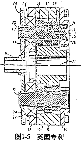 雙曲柄機(jī)構(gòu)中,如果在兩根曲軸上都有動(dòng)力輸入,則“死點(diǎn)”位置也就自然不存在了。因此,可以通過一套定軸傳動(dòng)機(jī)構(gòu)把動(dòng)力從一輸入高速軸傳遞到另一高速軸,從而克服機(jī)構(gòu)“死點(diǎn)”。根據(jù)這種原理制成的雙曲柄輸入少齒差行星齒輪裝置之不理的類型很多,如太原工學(xué)院五十年代研制的雙曲柄輸入漸開線少齒差減速器(見圖1-4)、英國專利(見圖1-5)、、重慶鋼鐵公司研制的單齒環(huán)雙曲柄輸入少齒差減速器(見圖1-6)、日本松本和幸等人研制的RV減速器(見圖1-7)。其特點(diǎn)都是通過外嚙合齒輪副將輸入動(dòng)力分流、傳遞到多個(gè)曲柄軸上,形式多軸輸入,從而克服“死點(diǎn)”。這種結(jié)構(gòu)的特點(diǎn)是其傳動(dòng)比為定軸傳動(dòng)的傳動(dòng)比與少齒差行星齒輪傳動(dòng)的傳動(dòng)比之乘積,因而可以通過改變外嚙合齒輪的齒數(shù)方便函地滿足不同傳動(dòng)比的要求,適應(yīng)性強(qiáng)。其不足之處是結(jié)構(gòu)復(fù)雜,而且在高速軸之間存在兩平行傳動(dòng)的剛性傳動(dòng)鏈(外齒輪嚙合副和雙曲柄機(jī)構(gòu))對(duì)誤差比較敏感,加工精度要求很高。