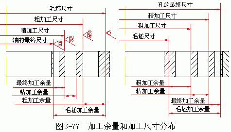 加工總余量也是個(gè)變動(dòng)值,其值及公差一般可從有關(guān)手冊中查得或憑經(jīng)驗(yàn)確定。如圖 3-77 表示了內(nèi)孔和外圓表面經(jīng)多次加工時(shí),加工總余量、工序余量與加工尺寸的分布圖。