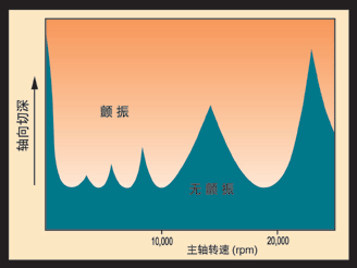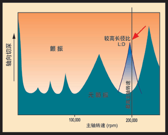 圖2 :該示意圖說明了由刀具、刀夾及高速主軸組成的特定系統(tǒng)中轉(zhuǎn)速和切深之間的關(guān)系。對(duì)于任何一個(gè)這樣的系統(tǒng),主軸轉(zhuǎn)速的上部分預(yù)計(jì)可以提供一個(gè)或多個(gè)""有效擊球點(diǎn)"",其中可以采用非常高的切深。