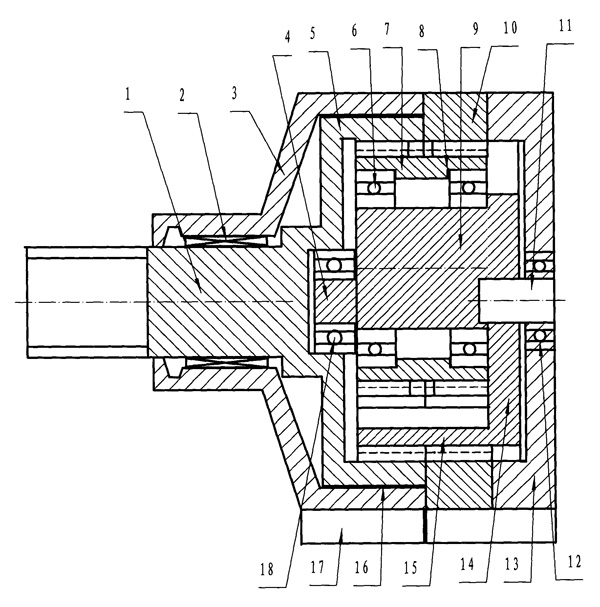 | 一種減速機(jī)包括外殼、齒輪、輸出軸,其特征在于:電動(dòng)機(jī)壓蓋與環(huán)形內(nèi)齒輪、外殼、固定底座固定連接,壓蓋外側(cè)中心有動(dòng)力輸入軸承,由平衡體圓軸、圓弧狀平衡塊、平衡體底板組成的平衡體,平衡體底板上有與圓弧狀平衡塊同心的動(dòng)力輸入軸孔,平衡體圓軸另一端有與動(dòng)力輸入軸孔同心的平衡塊凸軸,平衡體圓軸上用軸承安裝著雙聯(lián)齒輪,雙聯(lián)齒輪的右齒輪與環(huán)形內(nèi)齒輪嚙合,與輸出軸一體的輸出內(nèi)齒輪與雙聯(lián)齒輪之左輪相嚙合,安裝在外殼內(nèi),輸出內(nèi)齒輪與外殼間裝有聚四氟滑動(dòng)軸承,輸出內(nèi)齒輪側(cè)壁中心孔內(nèi)裝有平衡體凸軸和凸軸軸承,輸出軸與外殼間裝有輸出軸承。 |