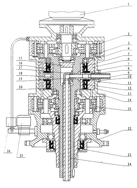 一種雙出軸噴液擺線減速機(jī),包括有輸出軸(23)、中間輸出軸(3)、擺線輪(2)和(21)以及中間法蘭(14),其特征在于中間法蘭(14)中設(shè)有輸入接管(9),該輸入接管(9)與液體管外套(8)聯(lián)結(jié),所述輸入接管(9)通過管接頭(19)橫向進(jìn)入中空的中間輸出軸(3)內(nèi),所述中間輸出軸(3)與管彎頭(17)聯(lián)接后再與液體輸出管(24)接通。