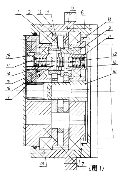 | 一種屬于曲柄擺線減速機(jī)或擺線減速機(jī)結(jié)構(gòu)形式的工業(yè)機(jī)器人微回差減速機(jī),其特征在于: (a)輸入軸[19]內(nèi)有一通孔; (b)輸入軸[19]裝配偏心軸承[4]、[5]部位上分別加工出同旋向的二螺旋槽,每一處螺旋槽系旋轉(zhuǎn)180°對(duì)稱(chēng)、同旋向二短槽,兩槽旋轉(zhuǎn)貫通,槽指向偏心軸承內(nèi)孔鍵槽; (c)輸入軸[19]內(nèi)孔有對(duì)應(yīng)于螺旋槽的二只拉桿[14]與[12],在桿的徑向分別裝配銷(xiāo)[16]與[13],銷(xiāo)的一端置于一側(cè)螺旋槽中,另一端伸出另一側(cè)螺旋槽而與偏心軸承內(nèi)孔鍵槽滑配,當(dāng)拉桿移動(dòng)時(shí),拉桿隨其上的銷(xiāo)沿螺旋槽移動(dòng)的同時(shí)并轉(zhuǎn)動(dòng),最終使二偏心軸承相對(duì)偏轉(zhuǎn)一小角; (d)拉桿[14]、[12]兩端分別有壓縮彈簧[11],彈簧初壓縮力使二偏心軸承相對(duì)偏轉(zhuǎn)一小角度而不再錯(cuò)開(kāi)180°。 |
