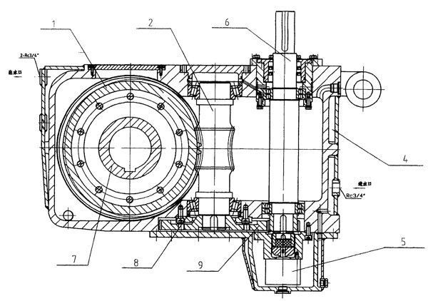 | 一種拉矯機蝸輪減速機,它是由輸入軸、軸承、斜齒輪副、蝸輪、蝸桿、密封圈、潤滑油泵、夾層水套箱體、空心輸出軸組成,其特點在于:輸入軸(6)與蝸桿(2)是立式軸,蝸輪軸為空心輸出軸(7),它是水平軸,電機為立式變頻電機,蝸輪(1)采用高強耐磨材料,空心輸出軸(7)的兩端裝有骨架橡膠密封圈(3),潤滑油泵(5)為雙向油泵,該蝸輪減速箱的動力由立式電機輸入,經(jīng)輸入軸(6)下面的斜齒輪(9),將動力傳給蝸桿(2),蝸桿(2)與蝸輪(1)嚙合,由空心輸出軸(2)將動力傳給拉坯輥,軸承(8)分別裝在三根軸的兩端,固定在箱體上。 |