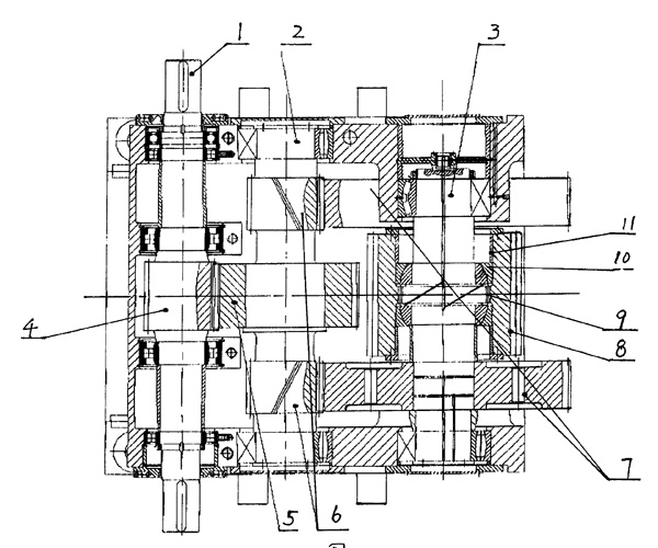 | 本實用新型提供了一種水泥磨機(jī)用單邊雙傳動減速機(jī),主要由第一軸1、第二軸2及第三軸3組成,其特征在于:第一軸1與第三軸3之間有第二軸2,第三軸3有兩個,兩個第三軸與第二軸2的軸間距相等,第一軸1上的小齒輪4與第二軸2上的大齒輪5為直齒嚙合,第二軸2上的小齒輪6同時與兩個第三軸3上的大齒輪7斜齒嚙合,并且同一軸上的兩個小齒輪6或大齒輪7螺旋方向相反,螺旋角相等,第三軸3的中部設(shè)置有圓柱齒輪8。本實用新型結(jié)構(gòu)簡單、緊湊,體積小,并且動力傳遞的均載同步性好。 |
