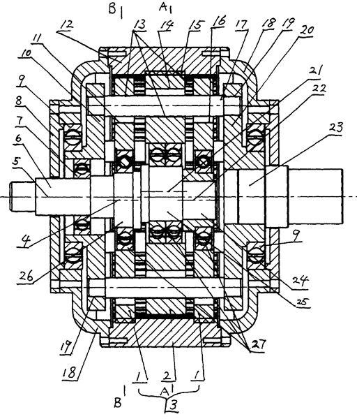 | 一種內(nèi)三環(huán)減速機(jī),其特征在于:由環(huán)板、雙偏心輸入曲軸、輸出軸、軸承、支架、內(nèi)齒圈、銷(xiāo)子、端蓋、封頭等組成,其中:雙偏心輸入曲軸包括輸入軸、環(huán)板對(duì)稱(chēng)軸,環(huán)板對(duì)稱(chēng)軸與輸入軸同軸不同心,輸出軸與輸入軸為同一對(duì)稱(chēng)軸;環(huán)板上帶有能穿過(guò)銷(xiāo)子的通孔,和能與軸固定的孔,環(huán)板由兩個(gè)環(huán)板(1)和一個(gè)環(huán)板(2)組成,兩個(gè)環(huán)板(1)與一個(gè)環(huán)板(2)重量相等且外徑相等,兩個(gè)環(huán)板(1)對(duì)稱(chēng)分面于環(huán)板(2)兩邊,兩個(gè)環(huán)板(1)的對(duì)稱(chēng)軸與環(huán)板(2)的對(duì)稱(chēng)軸夾角為180,環(huán)板上帶有相同的外齒,內(nèi)齒圈上帶有內(nèi)齒,環(huán)板外齒與內(nèi)齒圈內(nèi)齒為少齒差傳動(dòng)嚙合,支架上與環(huán)板對(duì)應(yīng)處開(kāi)有固定孔,銷(xiāo)子穿過(guò)環(huán)板上的通孔,其兩端分別固定在兩個(gè)支架的固定孔上,其中一個(gè)支架通過(guò)軸承固定在輸入軸上,另一個(gè)支架直接固定在輸出軸上,銷(xiāo)子與環(huán)板上的通孔相切,環(huán)板通過(guò)軸承固定在軸上,兩個(gè)支架通過(guò)軸承分別固定在輸入軸與輸出軸上,端蓋通過(guò)軸承固定在支架上,內(nèi)齒圈齒套在環(huán)板上,并與端蓋固接。 |