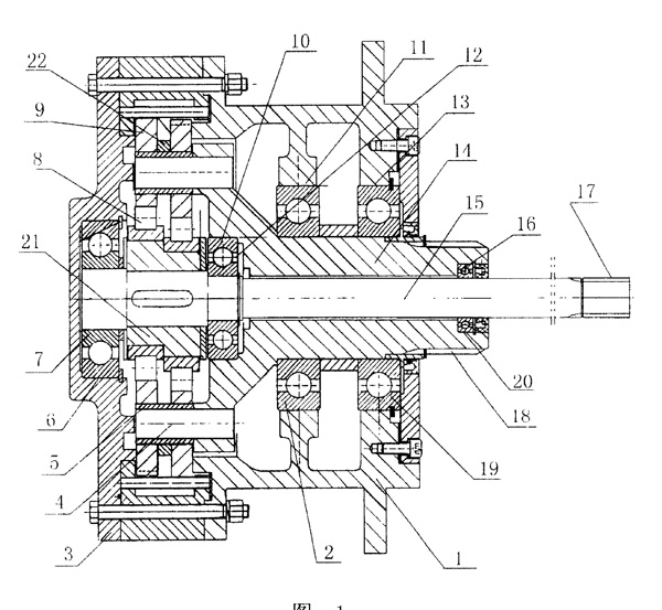 | 一種擺線針輪減速機(jī),包括殼體(1)、端蓋(3)、輸出軸(14)、輸出軸軸承(2,19)、輸入軸(15)及輸入軸軸承(7,10,16),其特征在于:輸入軸軸承(7,10,16)分別固定在端蓋軸承室(6)及輸出軸軸承室(12,20)內(nèi),輸出軸軸承(2,19)分別固定在殼體(1)內(nèi)的軸承室(11,13)內(nèi),輸入軸(15)上固定有偏心套(21),偏心套(21)上固定兩個偏心軸承(8),兩個偏心軸承(8)上分別固定中間有間隔環(huán)(22)的擺線輪(9),擺線輪(9)上的孔內(nèi)置有銷套(5),銷套(5)內(nèi)置有一端置入輸出軸(14)上的孔內(nèi)的銷軸(4)。 |