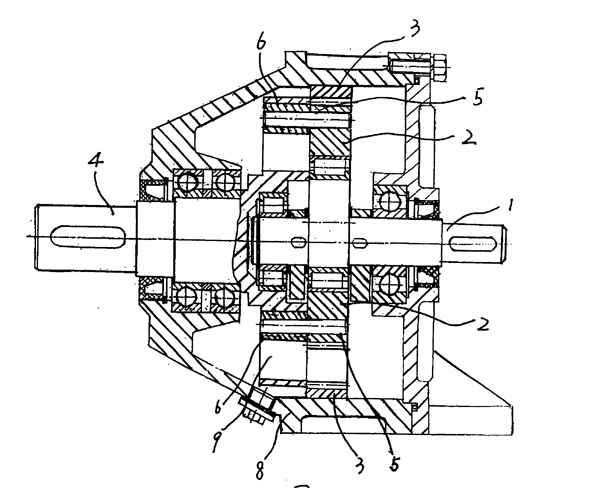 | 一種行星齒輪減速機(jī),包括機(jī)座[8]、設(shè)置在所述的機(jī)座[8]上的輸入軸[1]和輸出軸[4]以及內(nèi)齒輪[3]、設(shè)置在所述的輸入軸[1]上的行星齒輪[2]、柱銷[5]、套在所述的柱銷[5]上的柱銷套[6],所述的行星齒輪[2]與內(nèi)齒輪[3]相嚙合,其特征在于:所述的柱銷[5]與行星齒輪[2]相固定連接,所述的輸出軸[4]上開有滾道孔[9],所述的柱銷套[6]插在所述的滾道孔[9]內(nèi)。 |