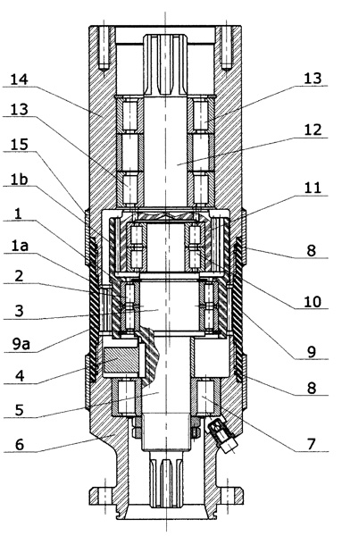 | 一種潛油泵專用減速機(jī),其主要結(jié)構(gòu)特征是雙聯(lián)行星齒輪安裝在輸入軸的偏心軸頸上,其下端的小齒輪與固定齒圈相嚙合,上端的齒圈與輸出軸上的小齒輪相嚙合,輸入軸的下端安裝在下接頭上,上端安裝在輸出軸上,輸出軸則安裝在上接頭上;由于偏心軸頸的作用,使行星齒輪在齒圈內(nèi)作既有公轉(zhuǎn)又有自轉(zhuǎn)的行星運(yùn)動(dòng),并帶動(dòng)輸出軸上的小齒輪轉(zhuǎn)動(dòng),輸出軸即可將該轉(zhuǎn)速輸出。本實(shí)用新型可使用在深度大于1000米的深井中,并能在100℃-200℃的高溫下及10兆帕以上的高壓下穩(wěn)定運(yùn)轉(zhuǎn),其超載能力及耐熱、抗磨損性能均極強(qiáng),結(jié)構(gòu)簡單緊湊,生產(chǎn)成本較低。 |