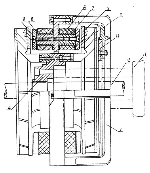 一種電渦流減速機(jī),由支架(1)、線圈固定盤(2)、葉輪(3)、軸套(4)和電氣控制箱(5)組成,其特征在于: a、線圈固定盤(2)包括線圈(6)和固定盤(7),線圈(6)固定于固定盤(7)的芯軸內(nèi),扇形板(8)、支架蓋(9)依次緊壓于固定盤(7); b、固定盤(7)通過法蘭盤(10)與支架(1)聯(lián)接為一體安裝于變速箱(11)上; c、軸套(4)裝于變速箱(11)的傳動軸(12)上,一對葉輪(3)分別裝于軸套(4)兩邊上; d、線圈(6)由旋鈕開關(guān)(13)與電氣控制箱(5)聯(lián)接。