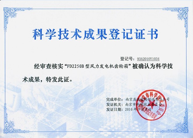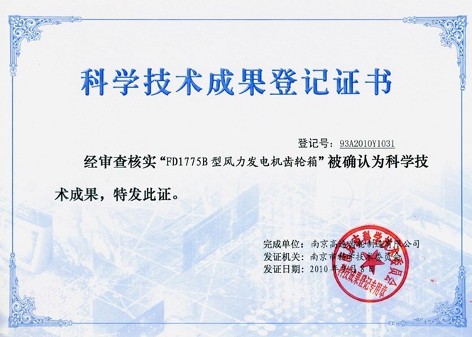 FD1775B、FD2250B型風力發(fā)電機齒輪箱”科技成果鑒定會。會議邀請了南京理工大學、南京航空航天大學、東南大學、南京市江寧區(qū)科技局等單位的專家、領導組成了鑒定委員會。鑒定委員會聽取了高速公司的項目研制工作總結等報告,審查了相關技術文件,考察了生產現(xiàn)場。最終一致認為高速公司研制的兩項產品總體技術水平達到了國際同類產品先進水平,同意通過科技成果鑒定,并希望進一步擴大國內外市場。