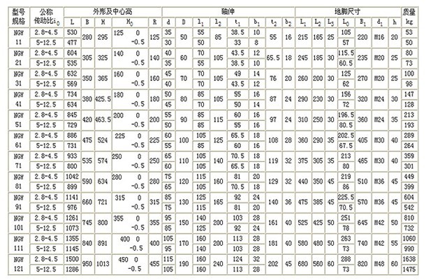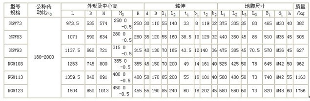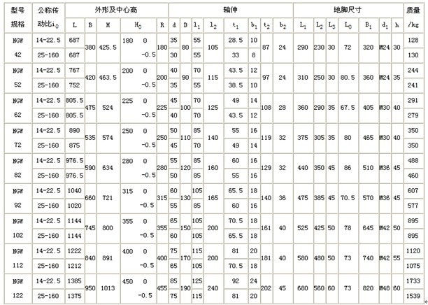 NGW型行星齒輪減速機主要構建有太陽輪、行星輪、內齒圈、行星架。 具有一下特點: 1、體積小、重量輕、在相同情況下,比普通漸開線圓柱齒輪減速機重量輕1/2以上,體積小1/2~1/3。 2、傳動效率高:單級行星齒輪減速機達97%~98%;兩級行星齒輪減速機達94%~96%;三級行星齒輪減速機91%~94%。 3、傳動功率范圍大:可以從小于1KW至1300KW,甚至更大。 4、傳動范圍大:i=2.8~2000 5、適應性強且耐用。 特點和適用范圍 結構特點 NGW型行星齒輪減速機主要構建有太陽輪、行星輪、內齒圈、行星架。 為了使三個行星輪的載荷均勻分配,采用了齒式浮動機構,即太陽輪或行星架浮動,或者太陽輪、行星架兩者同時浮動。減速機中的齒輪為直齒漸開線圓柱齒輪。具有一下特點: 1、體積小、重量輕、在相同情況下,比普通漸開線圓柱齒輪減速機重量輕1/2以上,體積小1/2~1/3。 2、傳動效率高:單級行星齒輪減速機達97%~98%;兩級行星齒輪減速機達94%~96%;三級行星齒輪減速機91%~94%。 3、傳動功率范圍大:可以從小于1KW至1300KW,甚至更大。 4、傳動范圍大:i=2.8~2000 5、適應性強且耐用。主要零件均采用優(yōu)質合金鋼經滲碳淬火或氮化處理,行星齒輪減速機運轉平穩(wěn)、噪音小、使用受命10以上。 6、用途和適用條件 NGW型行星齒輪減速器有單級(NGW11—NGW121),兩級(NGW42—NGW122)三級 (NGW73—NGW123)三個臥式系列。主要用于冶金、礦山、起重運輸機械設備,也可用于其它類似工礦條件下作動力傳動。 高速軸最高速不超過1500r/min 齒輪圓周速度不超過10m/s; 工作環(huán)境溫度為-40℃—45℃; 可正反兩向運轉。 NGW型行星齒輪減速器的一個重要特點是,內嚙合于外嚙合之間共用一個行星輪,NGW就是由“內、公、外”三字的漢語拼音的第一個字母組成的。
