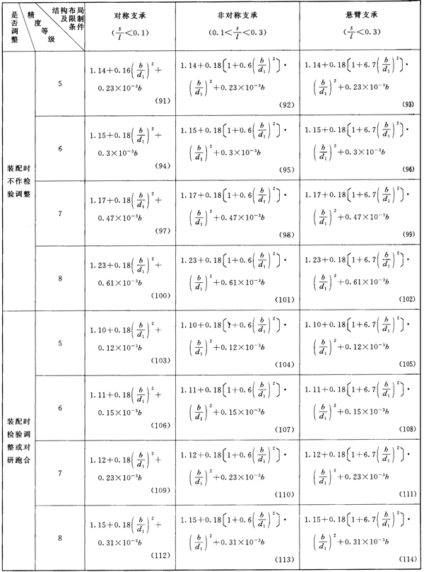 齒輪第Ⅲ公差組精度為5~8級(jí)(硬齒面為5~6級(jí))及相應(yīng)的結(jié)構(gòu)布局限制條件的KHβ簡(jiǎn)化計(jì)算公式見(jiàn)表14或表15。