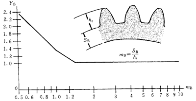 在薄輪緣齒輪根應(yīng)力基本值計(jì)算時(shí),應(yīng)增加一項(xiàng)輪緣系數(shù)YB,用以考慮輪緣齒高比mB對(duì)齒根彎曲應(yīng)力的影響。即對(duì)用方法一[見4.2.2a]計(jì)算σF0時(shí),本標(biāo)準(zhǔn)中式(12)應(yīng)改寫成