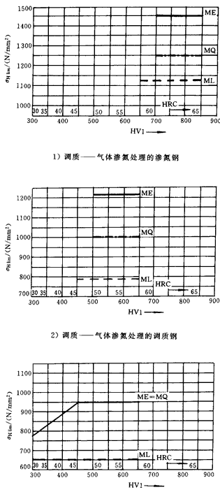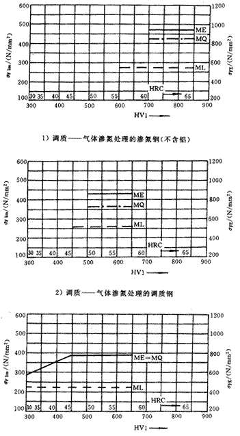 在σHlim和σFlim的圖中,給出了代表材料質(zhì)量等級(jí)的三條線,其對(duì)應(yīng)的材料處理要求見GB8539。