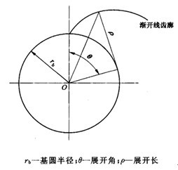 平面沿著一個固定的圓柱(基圓柱)作純滾動時,該平面上一條定直線(發(fā)生線)所展成的軌跡稱為圓柱的漸開線齒面;鶊A柱被垂直于軸線的平面所截的圓稱為基圓,基圓半徑以rb表示;漸開線齒面被垂直于基圓柱軸線的平面所截的曲線稱為漸開線齒廓(見圖2)。