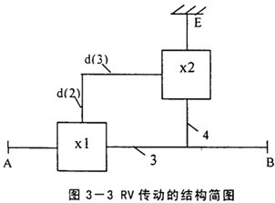 為計(jì)算RV傳動(dòng)的傳動(dòng)比,將上述的傳動(dòng)簡(jiǎn)圖用圖3-3所示的結(jié)構(gòu)簡(jiǎn)圖代替。該機(jī)構(gòu)簡(jiǎn)圖包括兩個(gè)簡(jiǎn)單行星機(jī)構(gòu):x1和x2。輸出件A為中心輪1,輸出件B為輸出盤6,且有ω6=ω4。支承件E為針輪7,漸開線行星輪2與轉(zhuǎn)臂(曲柄軸)3均為輔助件d。