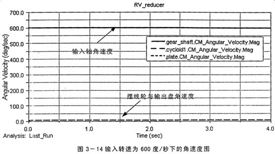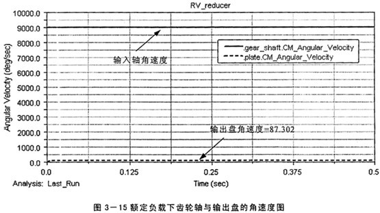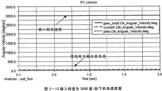 7=30,計(jì)算得到總的傳動(dòng)比為103,而由仿真得到的傳動(dòng)比在圖3-8中為i=3000/29.12=103.02,在圖3-9中為i=600/5.829=102.93,且圖中擺線輪與輸出盤的角速度相等說(shuō)明輸出部分施加的約束滿足等角速度輸出原理。