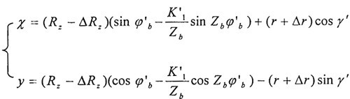 擺線輪的齒廓修形量是影響RV減速器傳動性能的重要參數,首先需建立一個概括上述的前兩種修形方法的通用擺線輪齒廓方程式,只要將標準齒廓方程式(3-l)中的Rz以(Rz-△Rz)代替,K1以K1′=e*zb/(Rz-△Rz)代替,r以(r+△r)代替,即可得到通用擺線輪齒廓方程式為: