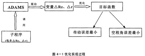 上已述及,擺線輪修形方式及修形量的選擇對RV減速器傳動誤差及空程角誤差的影響很大,因此進行優(yōu)化分析應將傳動誤差及空程角誤差作為目標函數,而將移距修形量△Rz及等距修形量△r作為設計變量,且△Rz與△r的正、負號表明了修形方式,子程序又是建立擺線輪的通用齒廓方程,通過ADAMS對子程序的調用,就可得到最優(yōu)的修形組合。具體的實現過程如下圖所示:
