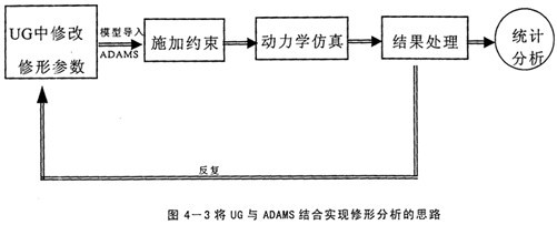 前面已經以擺線傳輸線的參數化建模為例,闡述了UG的強大的基于特征的參數化造型功能,既然用子程序的方式實現不了,將UG的該功能加以充分利用,也可以實現優(yōu)化修形的目的。實現的途徑是在建造擺線輪的表達式中考慮修形量△Rz與△r,這樣就建造了修形后的擺線輪,同時△Rz與△r是隨機可調的變量,可以得到任意組合的修形方式。并且UG的數據存儲具有單一數據庫的特點,零件圖中修改后,裝配圖及工程圖全都自動更新,不用人工去費時修改。然后,再將總裝配模型導入到ADAMS中施加約束。執(zhí)行仿真。這樣就得到多組修形組合的仿真結果,經過統計分析就可得到最佳的修形組合。具體思路如下圖所示。
