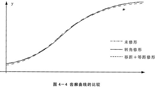 采用這種方法加工擺線輪時,磨齒機的調整和加工標準齒廓時相同,只是在磨出標準齒廓以后,將分齒機構和偏心機構的聯系脫開,然后撥動分齒掛輪上的齒輪,使工作臺轉過一微小的角度δ,從而改變了擺線輪在上一次磨削時的初始位置。這樣重新磨削后,就得到一條與標準齒廓基本上一樣的齒廓,僅整個輪齒變瘦一些,而齒間變大一些;其特點是同時嚙合齒數較多,但擺線輪的齒頂和齒根圓直徑沒有變化,該處與針齒相嚙合時沒有間隙存在,因此不能單獨使用轉角修形法。