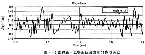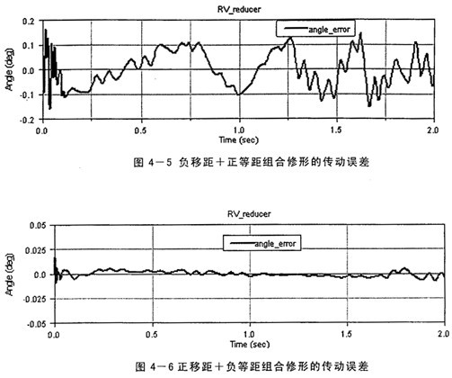 其中,θer一一角度運動誤差,一一任意時刻輸入軸轉角,i一一傳動比,θout一一輸出軸轉角。由于加工誤差、輪齒修形的原因引起瞬時傳動比的變化,必然出現傳動誤差,產生運動的不平穩(wěn)性。在RV減速器中,漸開線齒輪嚙合在前級,后級是擺線針輪傳動,由于后級的傳動比一般約是前級的4~30倍,前級的漸開線齒輪的傳動誤差將被縮小同樣的倍數后輸出,所以其傳動誤差關鍵取決于后級的擺線針輪的嚙合誤差,而實際工作中擺線輪的修形方式及修形量的選擇是影響擺線針輪的嚙合誤差很大的因素。因此本課題中僅研究了輪齒修形對傳動誤差的影響,所采用的修形量以及得到的傳動誤差大小如表4-1所示,限于篇幅,對于負移距+正等距、正移距+負等距和正移距+正等距組合修形的傳動誤差仿真結果曲線各只列出一組(圖4-5、4-6、4-7)。