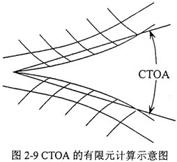 圖2-9表示了CTKOA的計(jì)算方法。由于在裂紋后方有很大的非線性變形,計(jì)算中張開位移用割線近似,采用8個(gè)單元的長(zhǎng)度來(lái)計(jì)算CTOA。這一長(zhǎng)度經(jīng)過(guò)與細(xì)化后的網(wǎng)格結(jié)果比較,誤差在10%之內(nèi)。