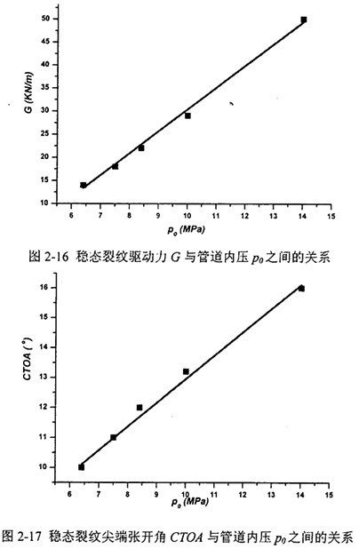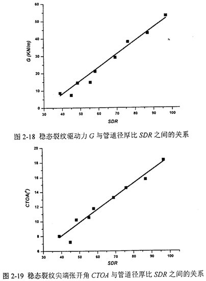 在裂紋穩(wěn)態(tài)擴(kuò)展的條件下,動(dòng)態(tài)能量釋放率G或裂紋尖端張開角CT(劉同管道內(nèi)壓p0或徑厚比SDR之間均呈線性關(guān)系。由此關(guān)系可便捷地推算任意設(shè)計(jì)參數(shù)下的裂紋驅(qū)動(dòng)力。通過(guò)和第四章介紹的小試件實(shí)驗(yàn)的動(dòng)態(tài)斷裂韌性結(jié)果相對(duì)照,可以得到裂紋止裂或擴(kuò)展的結(jié)論。