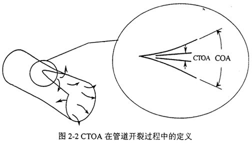 裂紋尖端張開角CTOA(Crack Tip Opening Angle)最早被用來(lái)分析核電站管路的穩(wěn)態(tài)裂紋擴(kuò)展,后來(lái)用于輸氣管線和航空工業(yè)。如圖2-2,與裂紋張開角COA不同,CTOA對(duì)應(yīng)于一定的斷裂擴(kuò)展?fàn)顟B(tài),不隨測(cè)量點(diǎn)的位置而改變。CTOA在數(shù)學(xué)上可以按下式定義: