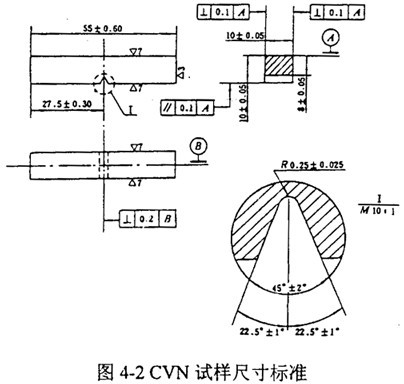 GB2106-80和ASMME23-96規(guī)定試樣標(biāo)準(zhǔn)尺寸為10×10×55mm,缺口深度為2mm。對于2/3尺寸試樣,厚度減為6.67mm,截面尺寸不變,如圖4-2。