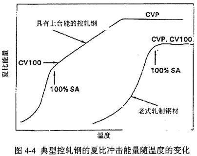 對于斷口上有分離的材料,隨溫度的升高,分離將最終消失,這是因為馬氏體和貝氏體帶也達(dá)到了上平臺溫度。圖4-4表示典型控軋鋼的夏比能量隨溫度的變化。夏比沖擊試樣上100%剪切面積對應(yīng)的最小夏比能稱為CV100。當(dāng)所有的分離都消失時,上平臺能CVP出現(xiàn),其大小可能高于CV100。