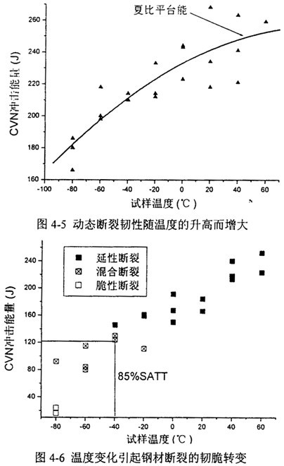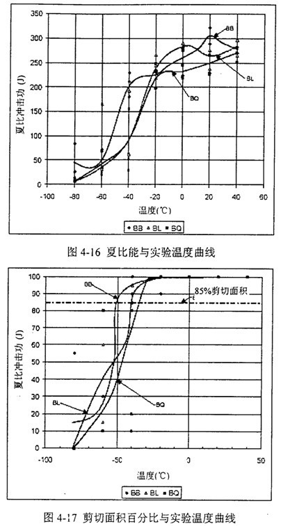 表4-3給出了歸納的夏比沖擊能量值及85%剪切面積對應(yīng)的轉(zhuǎn)變溫度。