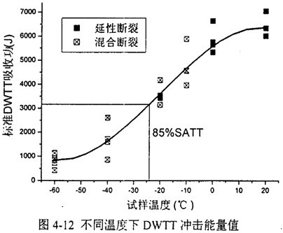 圖4-19顯示了標(biāo)準(zhǔn)壓制缺口DWTT試樣能量與實驗溫度數(shù)據(jù)。