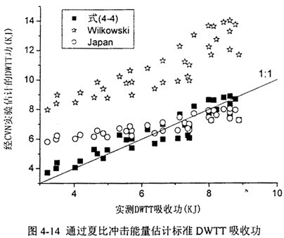 圖4-14將(4.2)~(4.4)式預(yù)測的對應(yīng)關(guān)系同真實實驗結(jié)果做了對比?梢钥吹綄τ谙嘟腃VN韌性預(yù)測結(jié)果,實際的DWTT功從低到高在大范圍內(nèi)分布。
