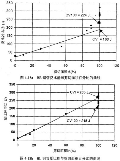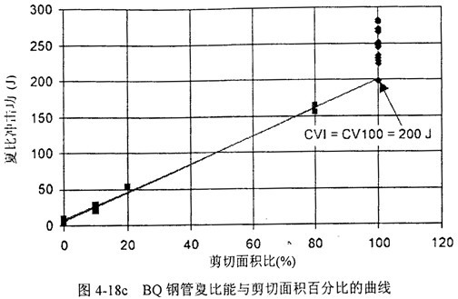 圖4-18a,b,c給出了三家鋼管的夏比能與剪切面積的關(guān)系,以及85%剪切面積對應(yīng)的轉(zhuǎn)變溫度。圖中CV100表示100%剪切面積時最低的夏比能,CVI表示最低夏比平臺能,也稱夏比轉(zhuǎn)變能,CVP表示夏比平臺能。菱形實驗點(diǎn)表示剪切面積高于90%,方形實驗點(diǎn)表示低于90%可以看到,剪切面積低于90%時,夏比能與剪切面積呈線性關(guān)系。