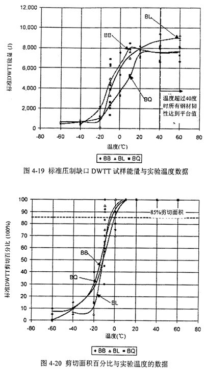 表4-4給出了這些DWTT實驗的特征值和85%剪切面積對應(yīng)的轉(zhuǎn)變溫度。