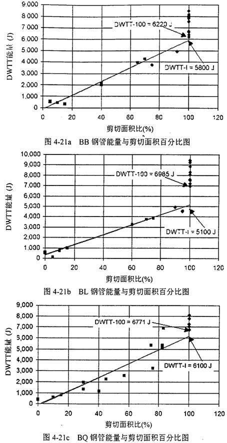 圖4-21a,b,c是能量與剪切面積百分比圖。和前面-樣,菱形實驗點(diǎn)表示剪切面積高于90%,方形表示低于90%。與對CVN數(shù)據(jù)的處理類似,分別定義DWTT-100表示100%剪切面積時最低的DWTT能,DWTT-I表示DWTT轉(zhuǎn)變能,DWTT-P表示DWTT平臺能。由圖4-21可確定DWTT和DWTT-100的值。