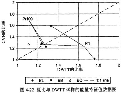 圖4-22是CVN與DWTT試樣的上臺能量特征值數(shù)據(jù)圖?偟膩碚f,CVN與DWTT試樣的特征能量比率有較好的一致性。圖中P/100的符合性比P/I更好,很大程度上是因為CV100、DWTT-100比CVN-I、DWTT-I的獲得方法更為明確。