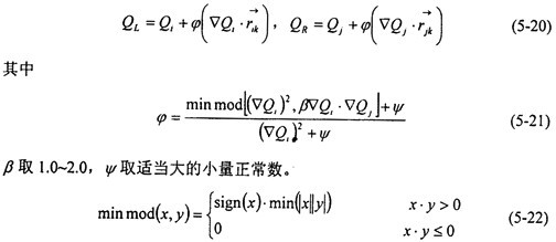 但是,由(5-18)直接得到的格式在激波附近是不穩(wěn)定的,將會出現(xiàn)非物理振蕩。迎風格式通過限制物理量的梯度值,來保證物理量在單元內的分布具有單調性,從而達到抑制間斷附近非物理振蕩的目的。這時,(5-18)式變?yōu)?/DIV>