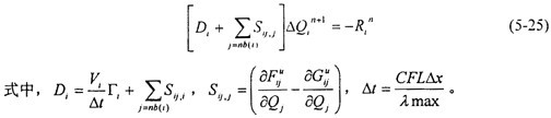 方程(5-24)可以采用顯式或隱式的方法進行求解。但是由于受時間步長的限制,采用顯式的R-K時間推進方法需要迭代的步數(shù)較多,計算很不經濟,因此本文采用了Gauss-Seidel迭代隱式求解的方法。
