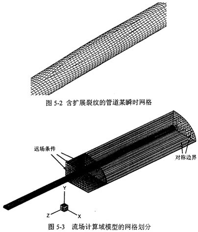 圖5-3是以圖5-2為依據(jù)建立的流場計算網格。設計參數(shù)為:裂紋擴展速度200m/s,管道外徑1016mm,壁厚14.7mm,內壓10MPa。