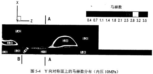 圖5-4給出了XZ對稱面上的馬赫數(shù)分布。管道中的流動在裂尖出口處達到超聲速,而在對稱面附近發(fā)生了強烈的回流。標示為B的位置壓力和密度發(fā)生了強間斷,意味著出現(xiàn)了激波。